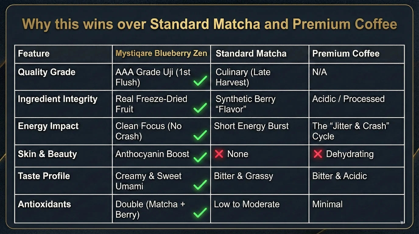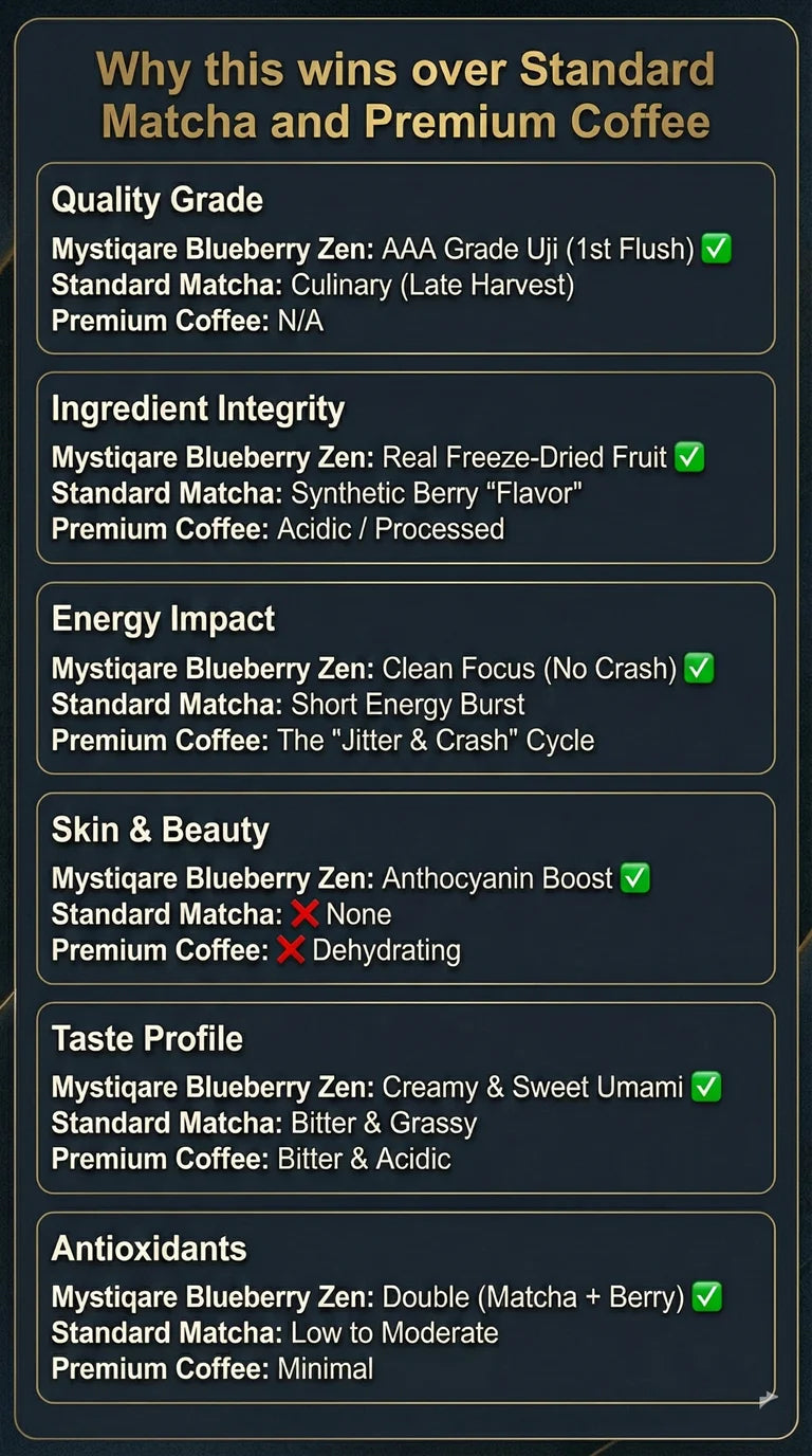Tired of "grass-tasting" matcha and sugary blueberry syrups? We’ve fused the world’s finest AAA Grade Uji Matcha with real, sun-ripened blueberries. It’s not just a drink; it’s a high-performance ritual for your brain and a deep-clean for your cells.